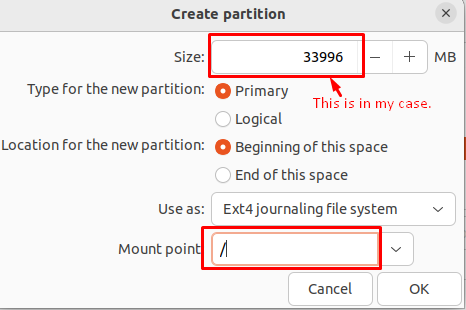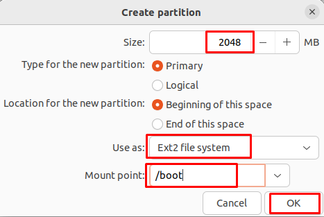 /bootstores the Linux kernel images. Set the following parameters.size 2048 MB type primary location beginning use as ext2 mount point /boot