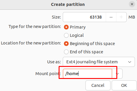 /homestores your files (application configuration, settings, pictures, etc)size ~65% (the last portion of free space) type primary location beginning use as ext4 mount point /home