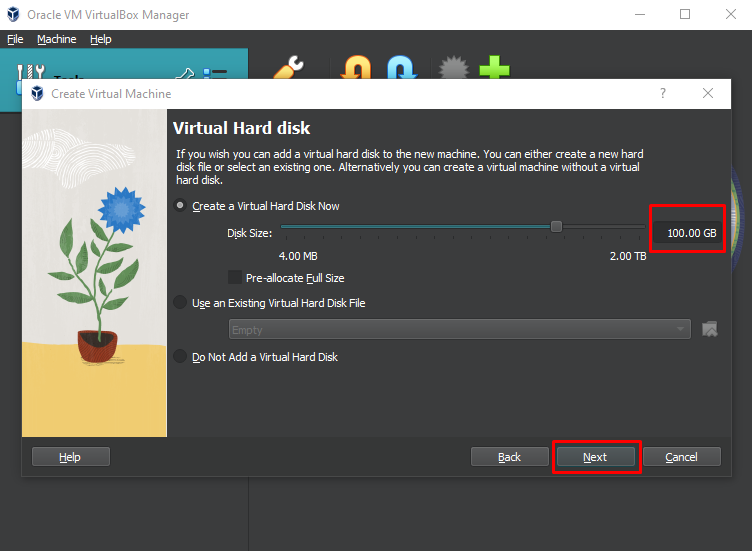 - Virtual Hard Drive (VDI): If you have 100 GB to spare on your computer, give it 100 GB. Do not pre-allocate the full size. Leave it as dynamically allocated so that it only uses up as much space as it needs. Then click next and Finish.