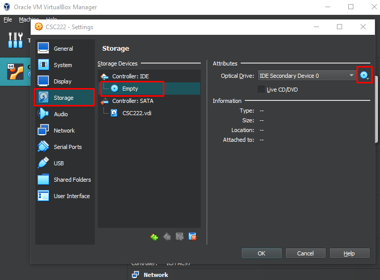 Storageon the left hand side and select💿 EmptyunderStorage Devices > Controller : IDEOn the right hand side of the window, click the disk icon